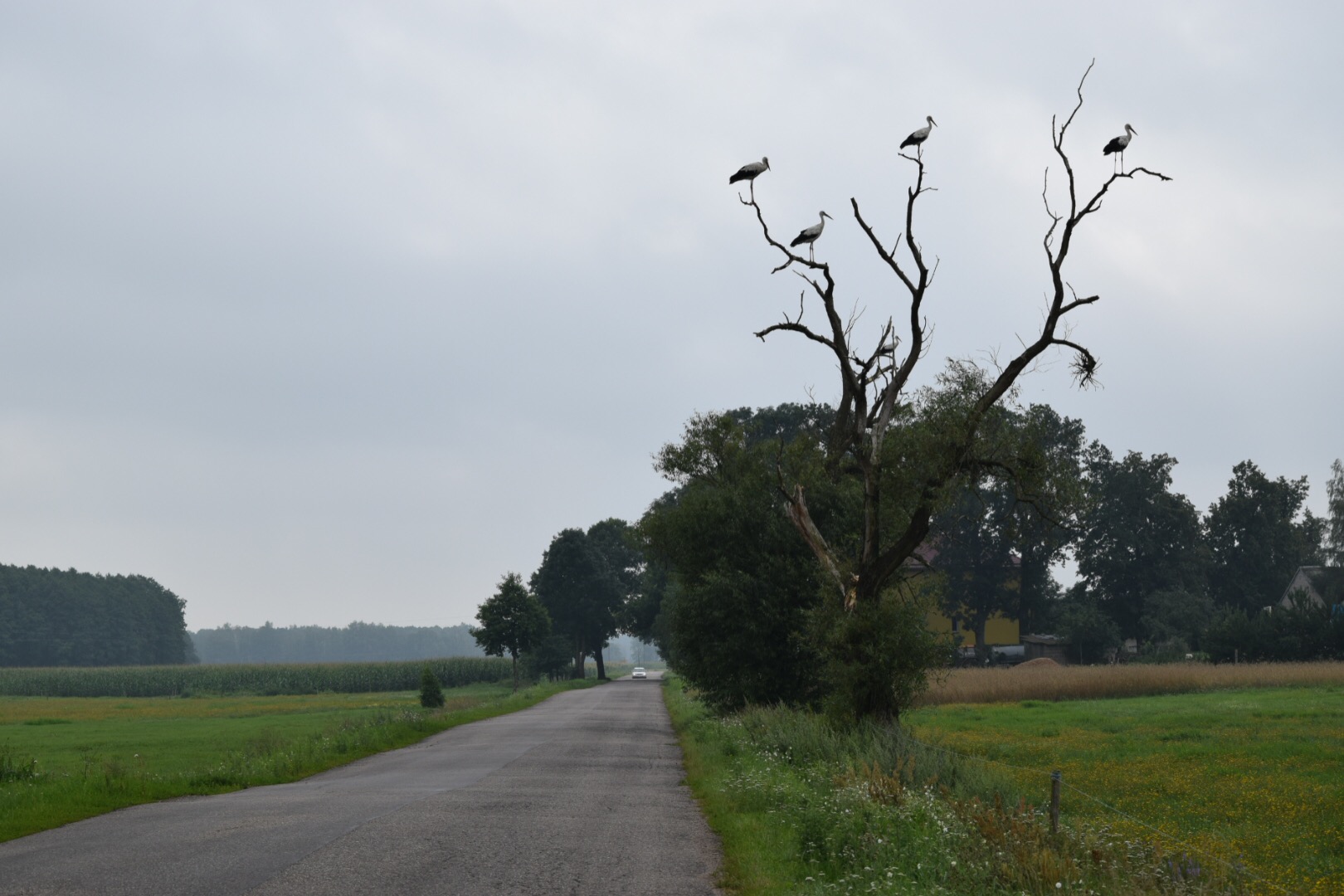 W zasadzie już od Stańczyków, co jakiś czas, nasza trasa pokrywa się z Podlaskim Szlakiem Bocianim, który jest najdłuższym znakowanym szlakiem rowerowym województwa podlaskiego (liczy 412,5 km). Łączy najpiękniejsze miejsca tego regionu oraz cztery parki narodowe: Wigierski, Biebrzański, Narwiański i Białowieski. Również i dziś szlak Green Velo w znacznej mierze się z nim pokrywał. Przy większości przydrożnych słupów znajdowały się bocianie gniazda i okazałe osobniki. Również na łąkach roiło się od spożywających śniadanie boćków. Niektóre dały się nawet sfotografować! 🙂