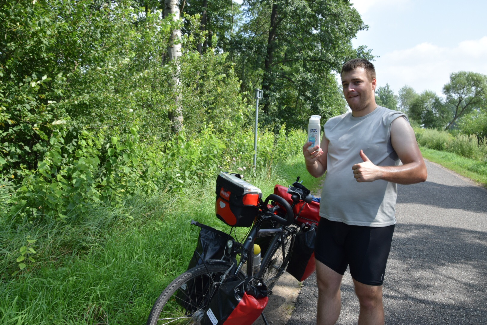 Dzień zapowiadał się dobrze. Było rześko i pochmurnie – idealna pogoda do pedałowania. Około 9.00 wyruszyliśmy z Białobrzegów w kierunku Goniądza. Niezwykle wypoczęci w świeżo wypranej bieliźnie ruszyliśmy przed siebie, napawając się świeżym powietrzem, zapachem żywicy i leśną drogą. Ciepłe dni i nocne burze powodują, że przy drogach z siodełka można dostrzec piękne kapelusze borowików szlachetnych i podgrzybków (po drodze mijaliśmy nielicznych grzybiarzy z pokaźnymi okazami). Jagód w lasach również nie brakuje, jednak ze względów praktycznych pozostaje nam je tylko podziwiać.