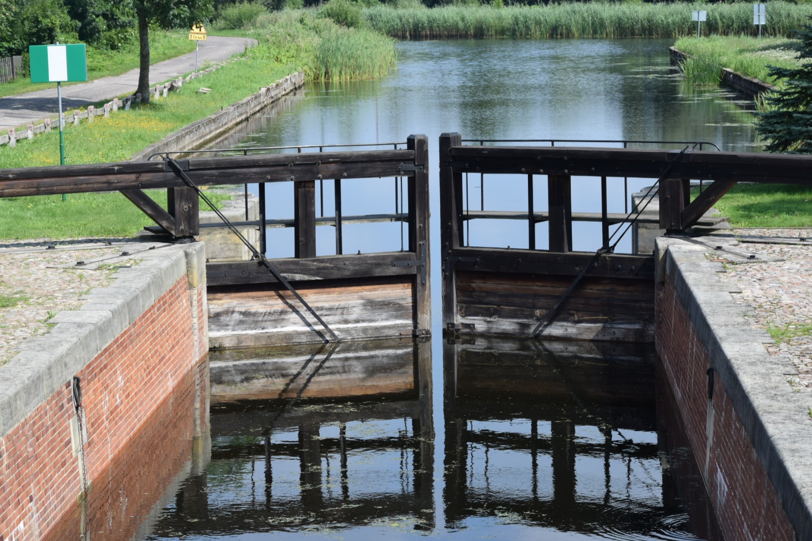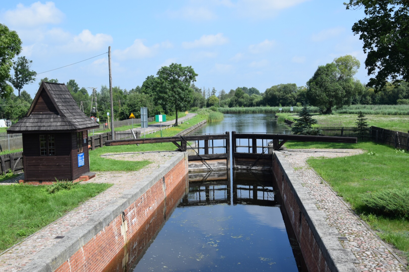 Po przekroczeniu granicy Biebrzańskiego Parku Narodowego w Dębowie minęliśmy kolejną, ręcznie napędzaną śluzę, gdzie Kanał Augustowski łączy się z wodami Biebrzy. Dzięki uprzejmości sympatycznego i rozmownego wartownika mogliśmy jako jedni z nielicznych wejść na teren obiektu i przyjrzeć się z bliska temu dziewiętnastowiecznemu zabytkowi techniki oraz tablicy, która upamiętniała jego budowniczego.