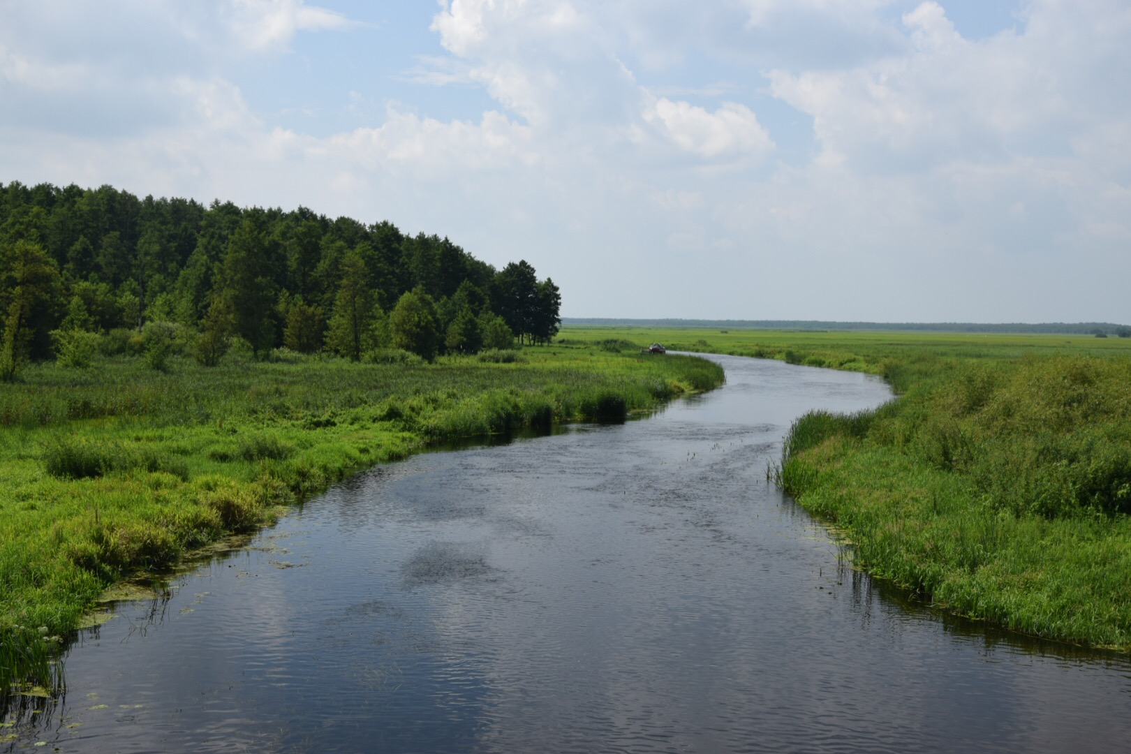 Dalej nasza trasa biegła wzdłuż koryta Biebrzy. Piękne, malownicze i rozległe łąki zdążyły się już skąpać w południowym słońcu. Na rzece można było dojrzeć nielicznych kajakarzy i turystów na tratwach. Napotkaliśmy również fotograficzną ekspedycję, która zmierzała w przeciwnym do nas kierunku w poszukiwaniu różnych gatunków ptaków.