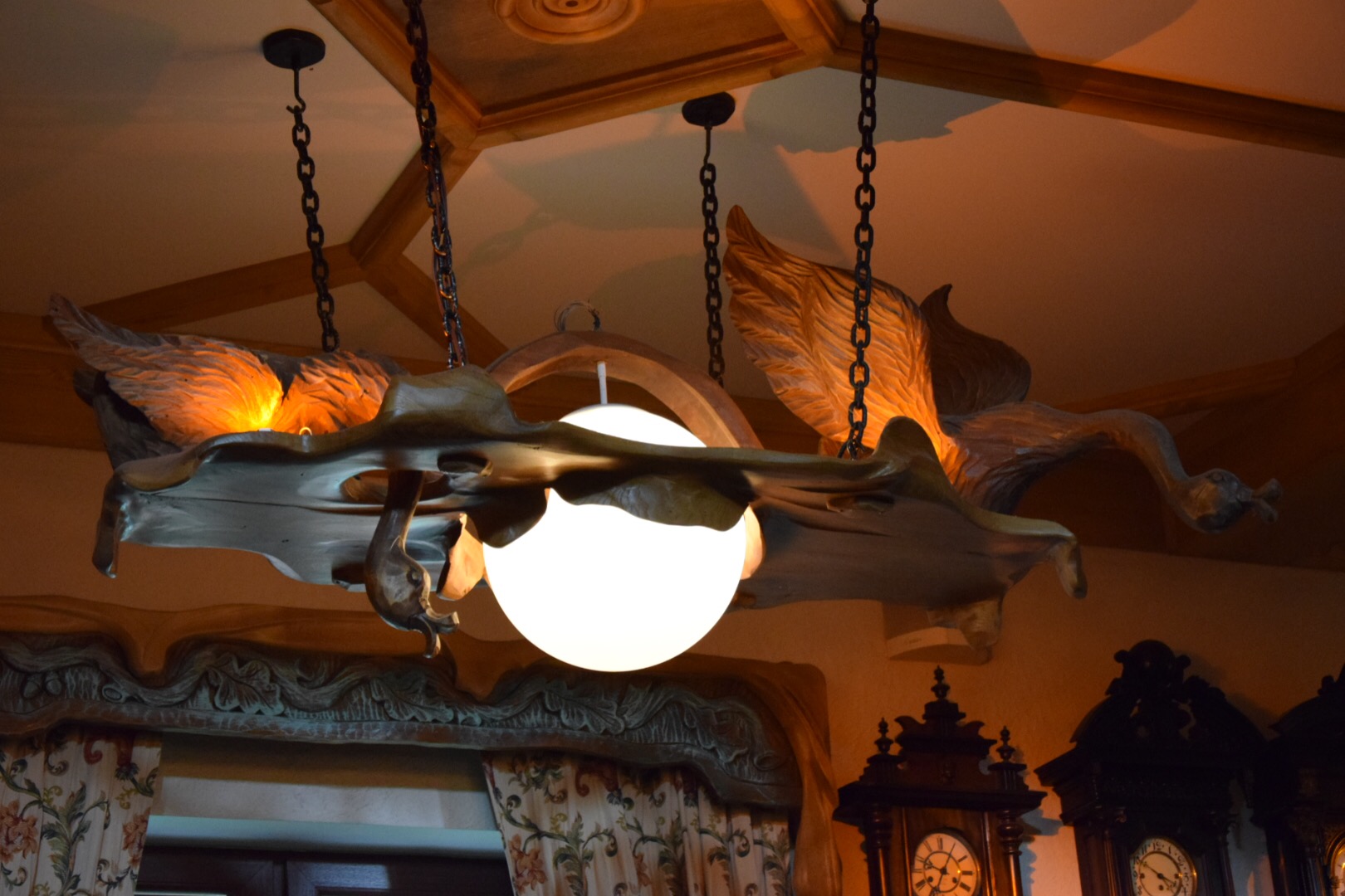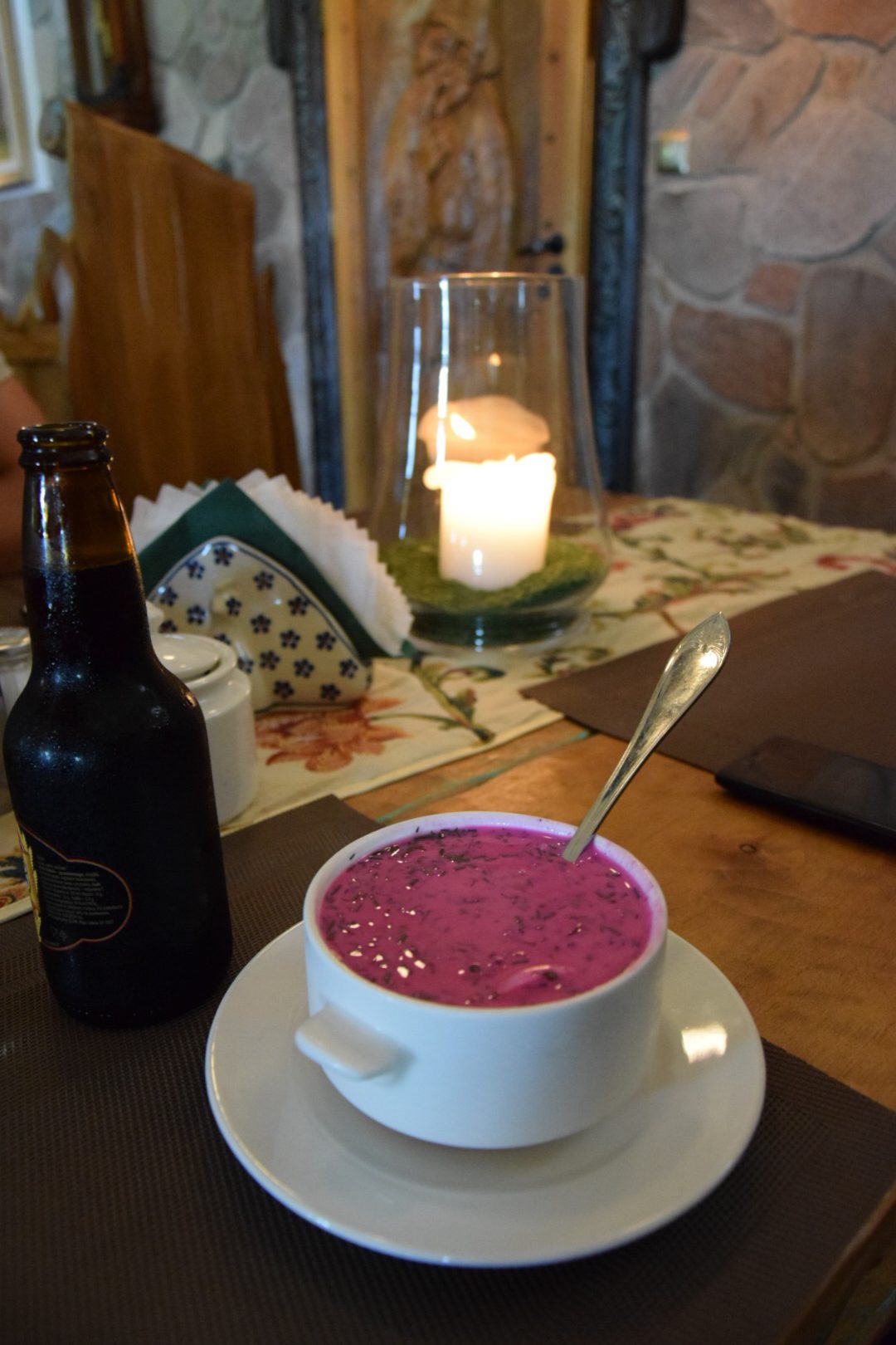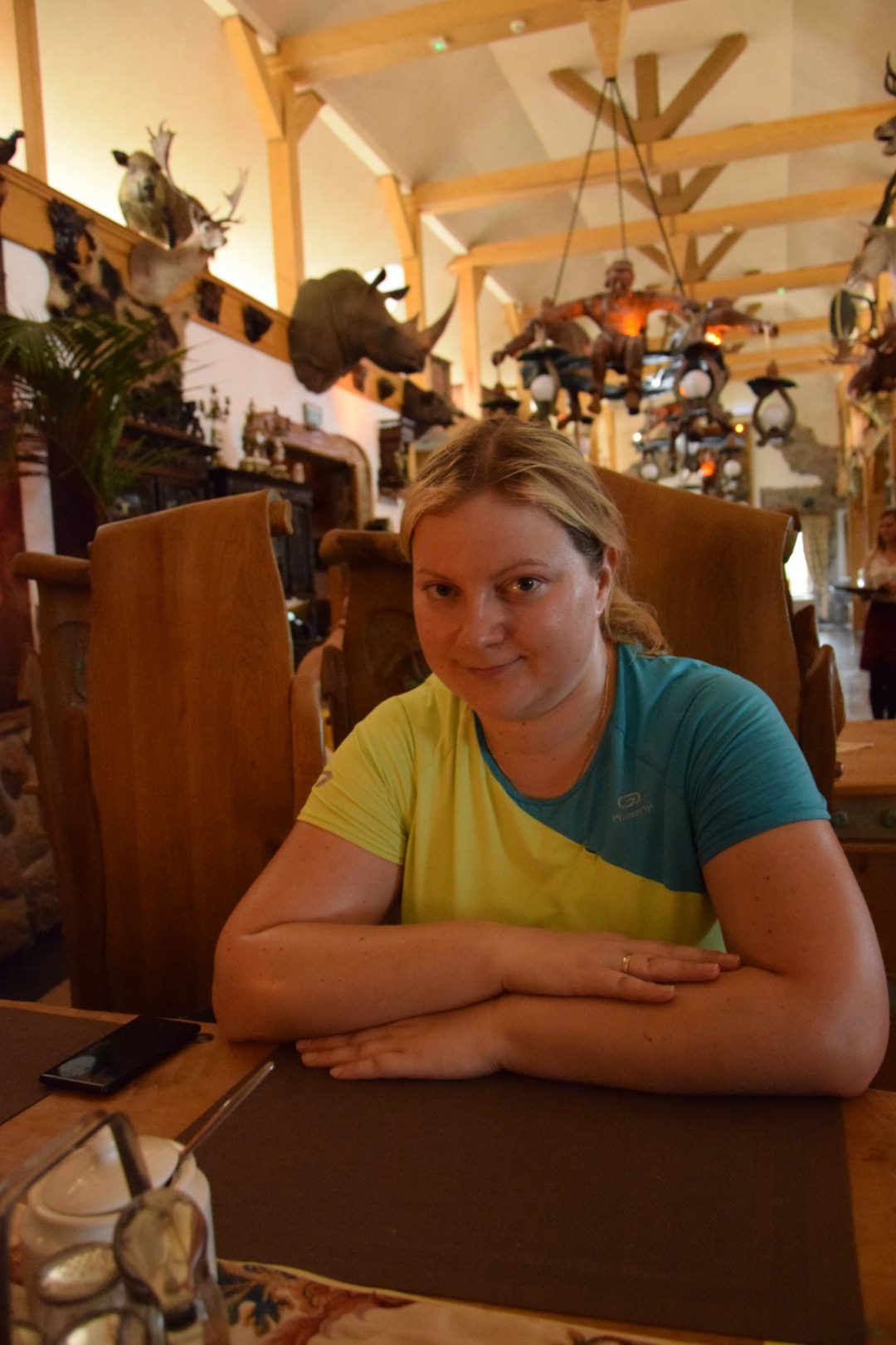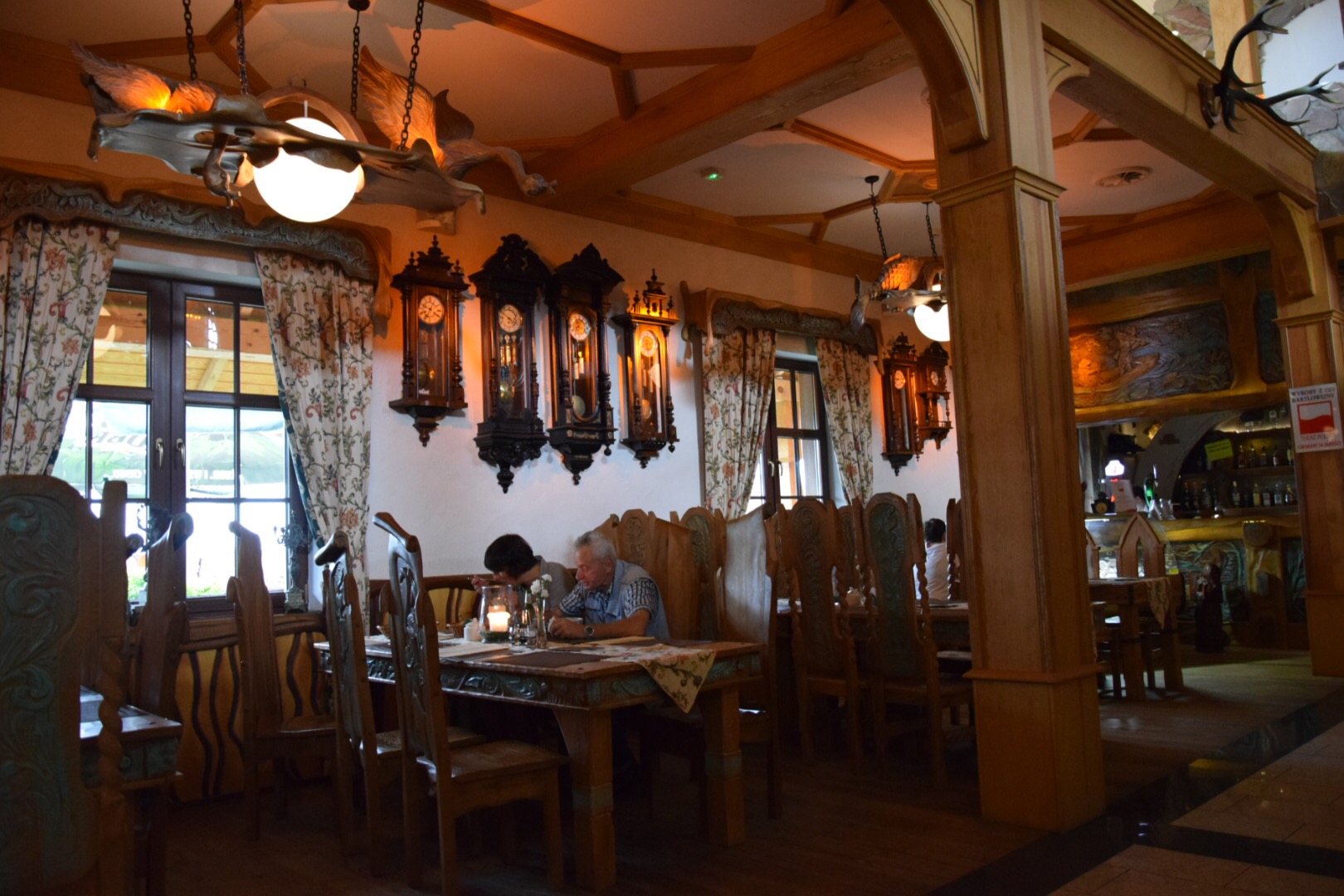 Piękna panorama niewielkiego Goniądza, nad który zmierzały pokaźne nimbostratusy zmobilizowała nas, by jak najszybciej przedostać się do Karczmy Bartla, polecanej przez nasz przewodnik i wcześniej napotkanych sakwiarzy. Tuż po przekroczeniu progu restauracji, rozpadało się na dobre. Niezwykłe wnętrze karczmy, znanej w całej okolicy, z pięknie rzeźbionymi meblami i okazami dzikich zwierząt, bryczkami, karocami, zegarami wahadłowymi zapraszało na ucztę. Klimat miejsca podkreślała piękna polska muzyka (Niemen, Grechuta, Czerwone Gitary, Skaldowie).
