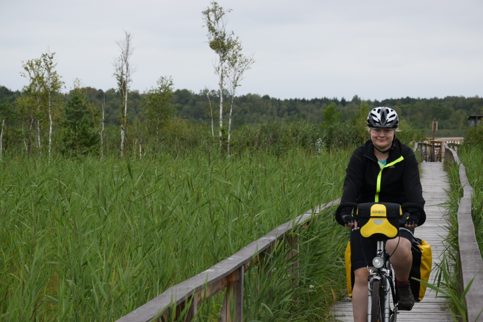 Były już asfalty, piaski, szutry, a nawet podmokłe nadbiebrzańskie łąki. Opony naszych rowerów pokonywały przeróżne rodzaje podłoża. Dziś jednak chyba po raz pierwszy jeździliśmy po bagnie… a nawet po wodzie rzec śmiało można! Niemożliwe? Takie rzeczy tylko w Poleskim Parku Narodowym!