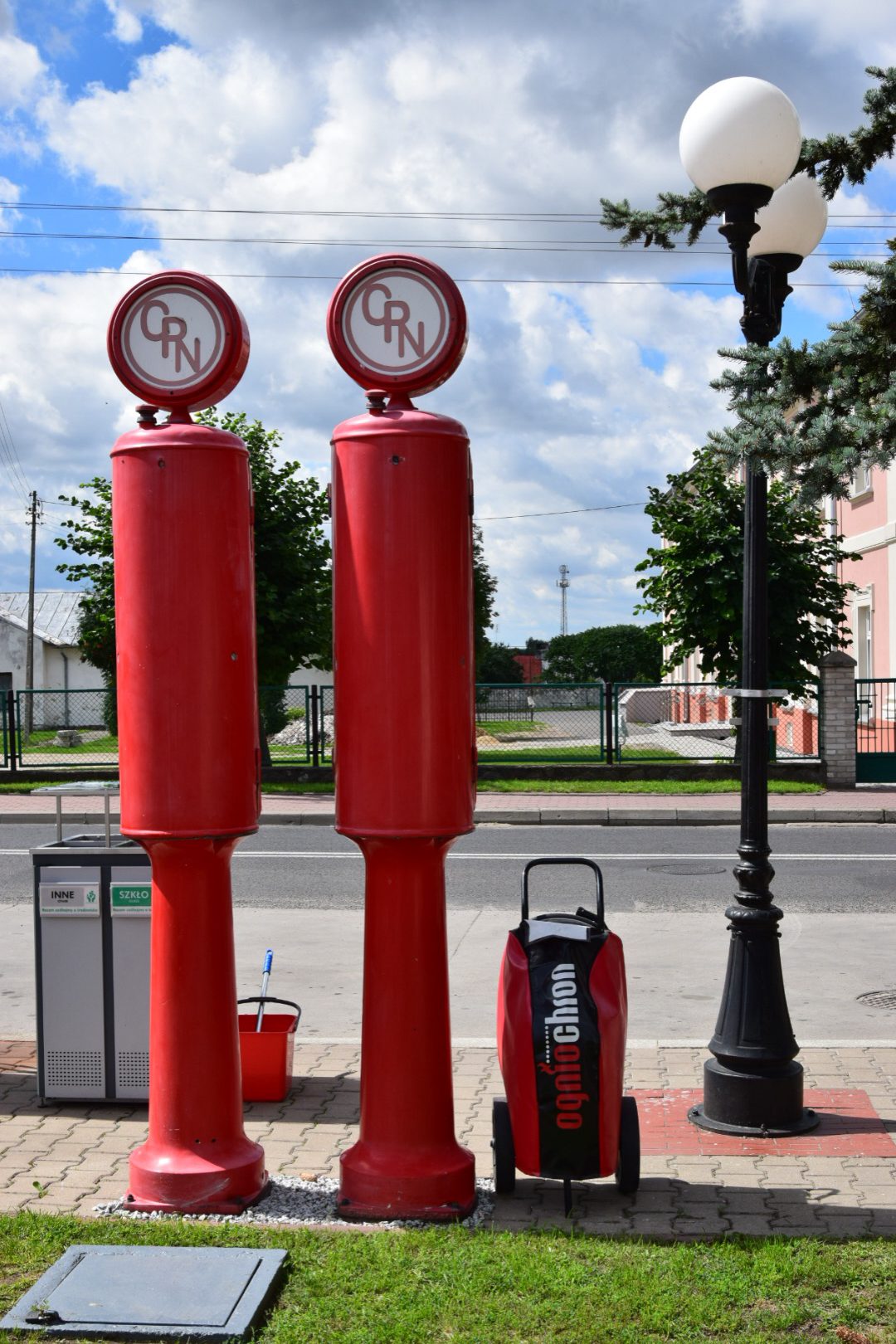 Niedługo potem, po kilkunastu kilometrach, dotarliśmy do Janowa Podlaskiego, znanego najszerzej ze sławnej stadniny koni arabskich. Stadnina owszem tu jest, ale nieco dalej, we wsi Wygoda. Nas bardziej zainteresowała małomiasteczkowa zabudowa z zabytkowymi kościołami (obecny kościół kolegiacki był niegdyś nawet katedrą diecezji łuckiej!). Ale to nie kościoły czy zabudowa były najciekawsze. Przy janowskim rynku znajduje się stacja benzynowa przy której zachowały się… przedwojenne dystrybutory paliwa z ręcznymi pompami! Producent: Temper Extakt, rok produkcji: 1928. Prawdopodobnie jedyne takie urządzenia w Polsce, do tego nie w muzeum! Oczywiście dziś już paliwa nie pompują, ale jako ciekawostka turystyczno-krajoznawcza spisują się świetnie. 🙂