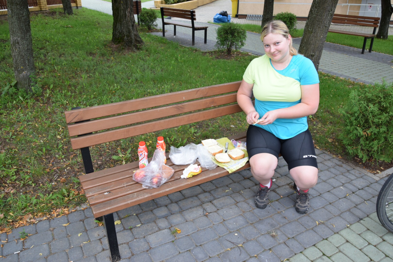 Dzień rozpoczęliśmy od śniadania polowego, a raczej „ławkowego”. Jedzenie pierwszego posiłku, będąc spakowanymi i gotowym do drogi, daje prawdziwego kopa na początek rowerowego poranka. Zjadasz, wsiadasz na rower i jedziesz… aż do drugiego śniadania. 😉 Tak właśnie opuściliśmy gościnne Michałowo i pomknęliśmy na południowy wschód, do puszczy!
