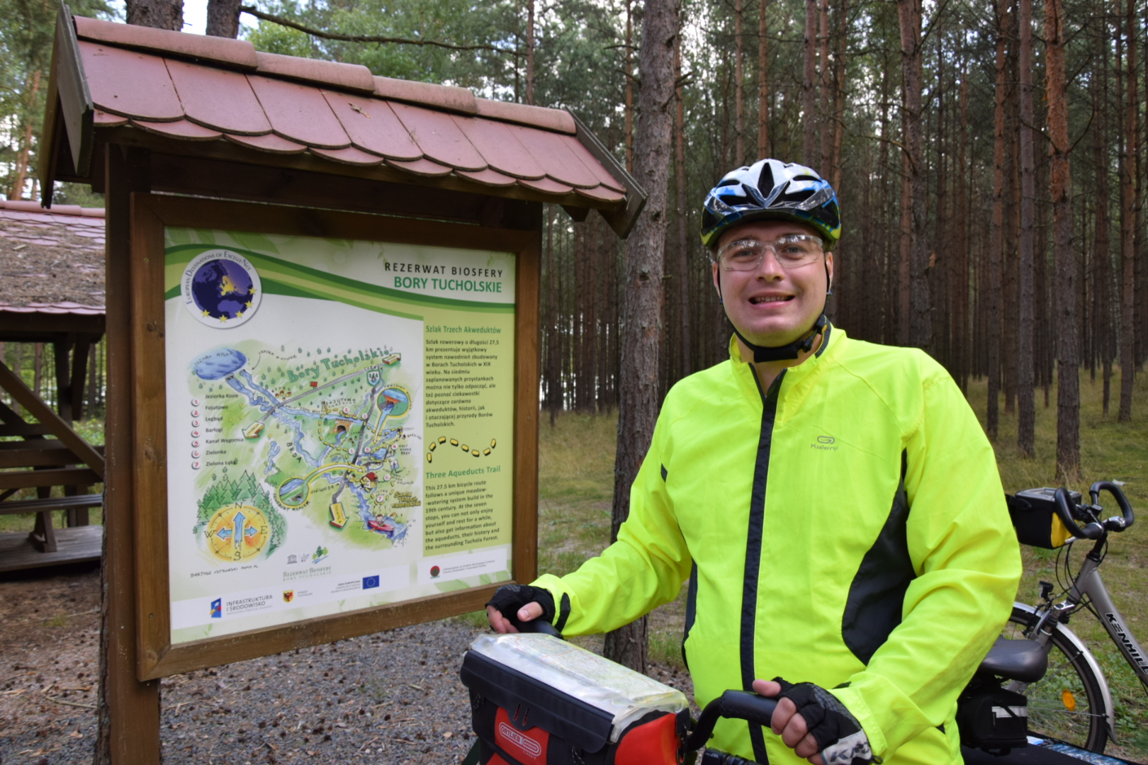 Turystyczny poranek rozpoczęliśmy od rundy honorowej po tucholskim rynku. Pokręciliśmy się też chwilę po mieście w celu uzupełnienia zapasów wody oraz prowiantu na drogę i po załatwieniu wszystkich drobnych sprawunków wyruszyliśmy na północ. Mimo że wystartowaliśmy nieco później i słońce zaczęło już przyjemnie ogrzewać nasze plecy swymi promieniami, było odczuwalnie chłodniej niż wczoraj, a tym bardziej niż w zeszłym, upalnym tygodniu. Ostrzejsze podmuchy wiatru oraz chowające się od czasu do czasu za chmurami słońce szybko przekonały nas do założenia kurtek. Pierwsze kilometry pokonaliśmy wśród pól otaczających od tej strony Tucholę, ale bardzo szybko znaleźliśmy się z powrotem w borze. Zmierzaliśmy do niezwykle ciekawego zabytku inżynierii wodnej…