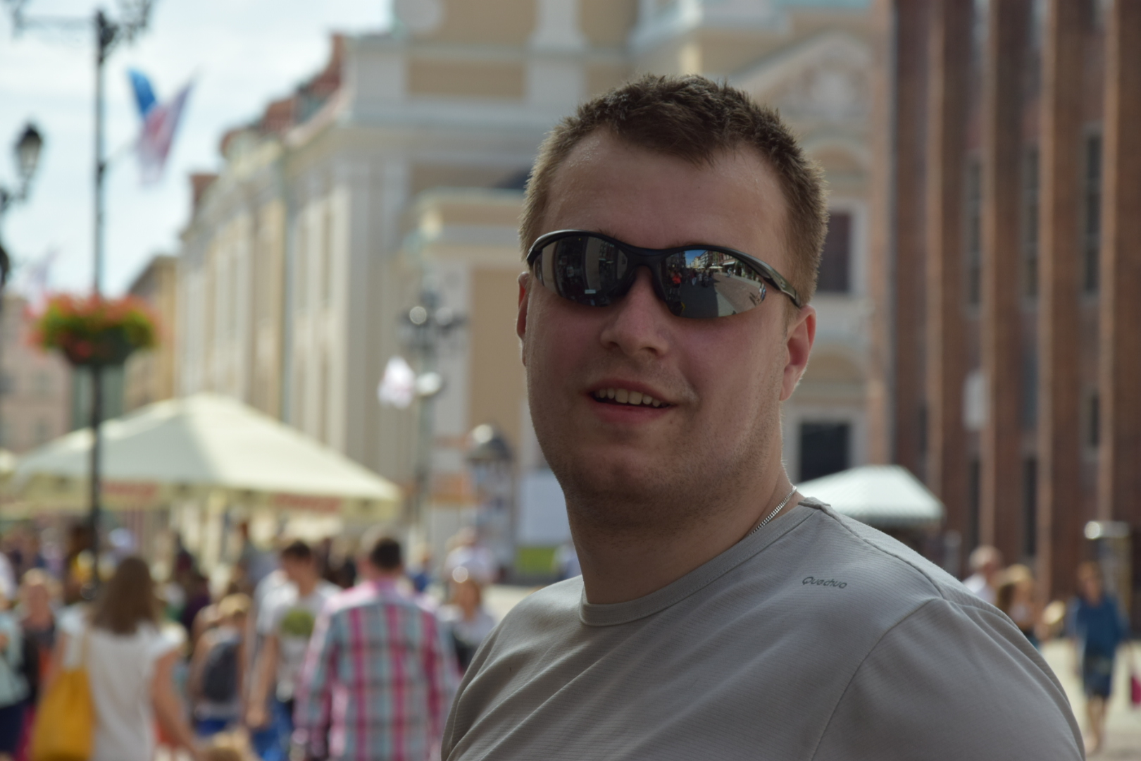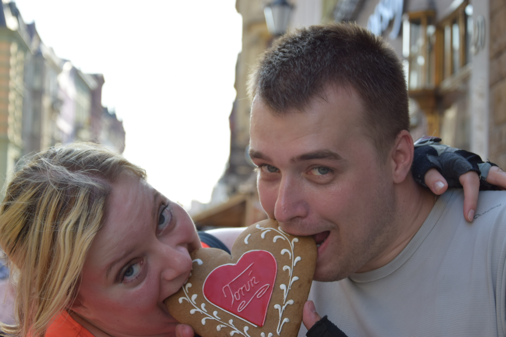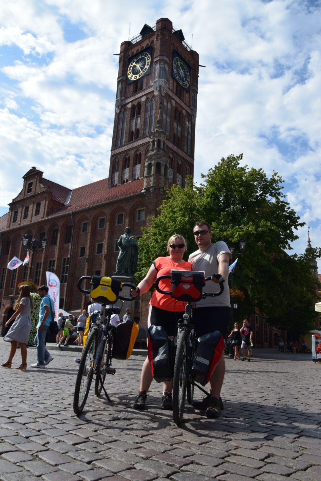 Miasto piernika i Kopernika (lub odwrotnie, jak kto woli) powitało nas zarówno niesamowitym wręcz ukropem, jak i przepięknym widokiem na Starówkę z mostu Piłsudskiego. Z naszych krtani wyrwał się suchy (było strasznie gorąco!), ale szczery okrzyk zachwytu. Zjechaliśmy na bulwary nadwiślańskie i tempem paradnym przez Bramę Mostową wkroczyliśmy do średniowiecznego miasta królewskiego – Torunia. W samym jego sercu powitał nas Mikołaj Kopernik, pilnujący z wysokiego cokołu co by Ziemia się ruszała, a Słoneczko nie (dziś naprawdę by się mogło ruszyć, najlepiej za jakąś dużą chmurę). Zrobiliśmy pamiątkowę fotkę i… zaczęliśmy piernikowe łowy!