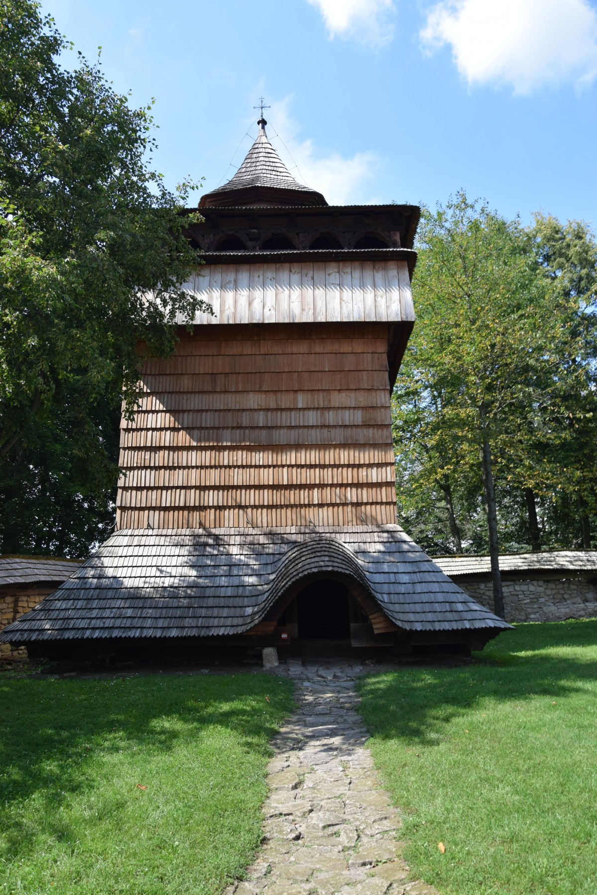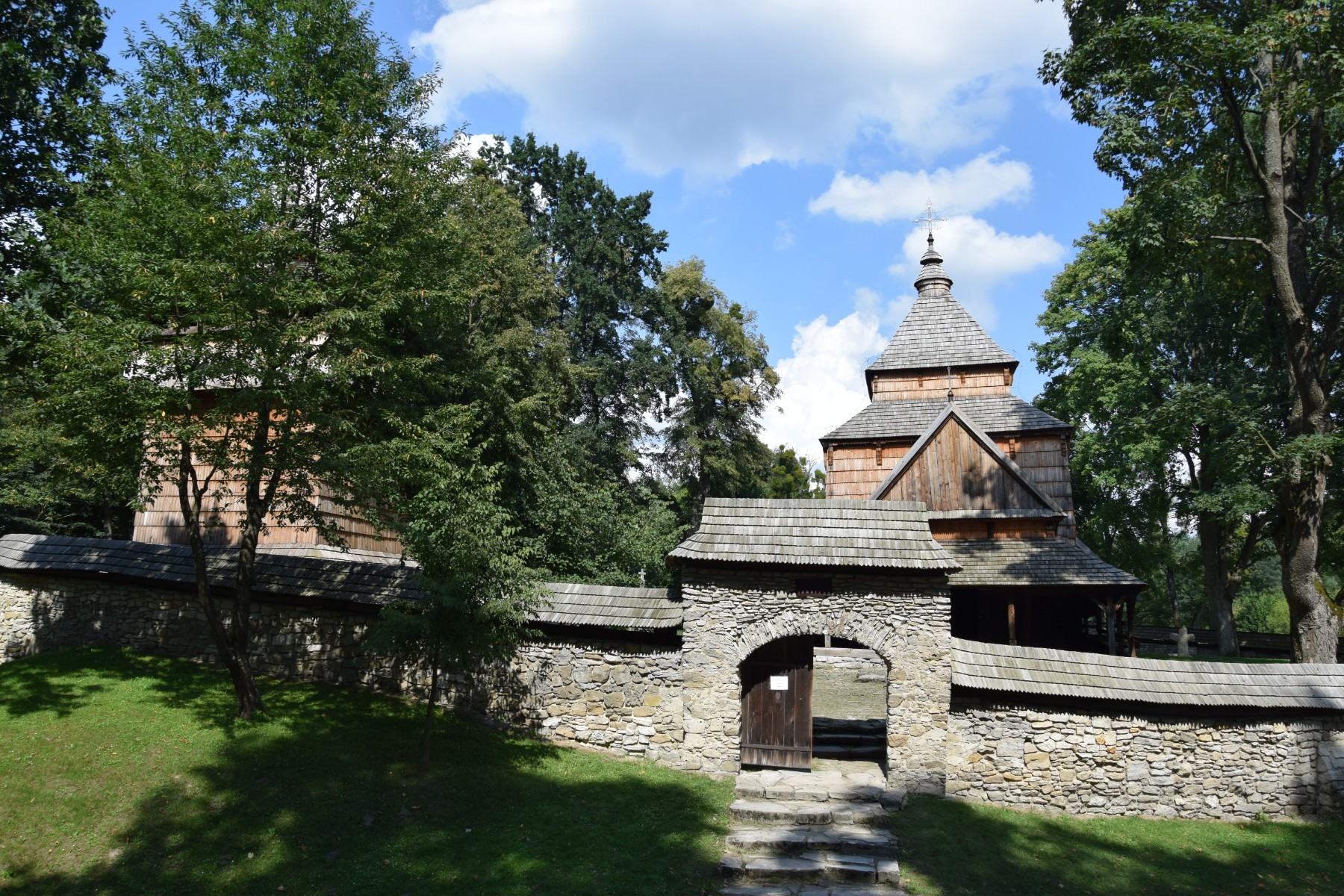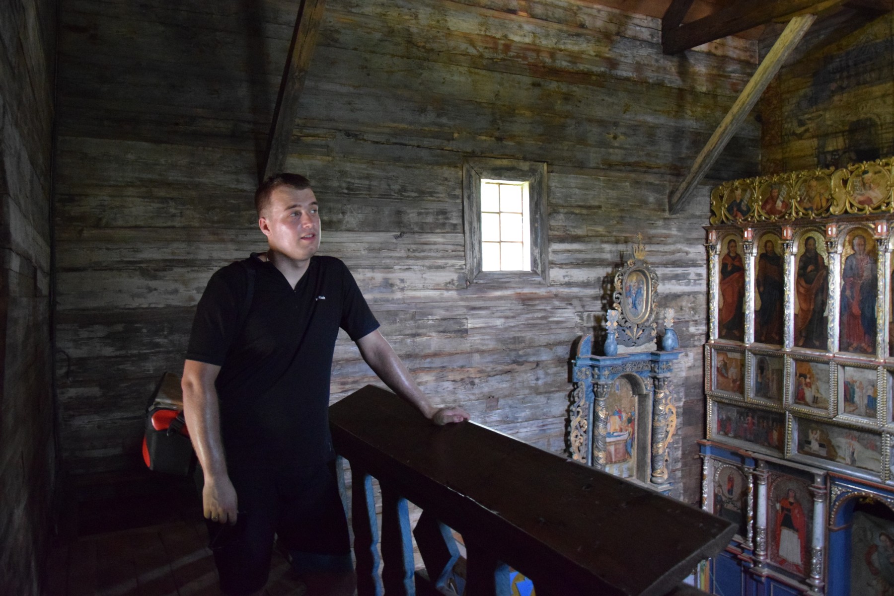 Przed nami rozciągała się znakomita asfaltowa droga, biegnąca głównie lasami, prowadząca najpierw na wschód w kierunku granicy, a później na północ wzdłuż jej biegu. Ruch samochodowy znikomy, Straż Graniczna pilnuje – jechaliśmy wręcz odprężeni… 😉 Jedyne, co prawdziwie dawało nam się we znaki, to wszędobylskie bąki bydlęce (jak mówią internety powszechnie mylimy je z gzami), które co i rusz chciały zakosztować naszej krwi. Dopóki jechaliśmy, nie było źle! 😉 Ciężka rowerowa praca w najgorętszych godzinach dnia wkrótce przyniosła nam zasłużoną nagrodę. Naszym oczom ukazał się znak drogowy „Cerkiew UNESCO 100 m” i już wiedzieliśmy, że jesteśmy na miejscu. Cerkiew św. Paraskewy w Radrużu, pierwotnie prawosławna, później greckokatolicka obecnie jest placówką muzealną – filią odwiedzonego przez nas dzisiaj Muzeum Kresów w Lubaczowie. Zachowana w ramach całego zespołu obronnego (w obrębie murów) z drewnianą dzwonnicą, kostnicą i cmentarzem! Chociaż w środku z wyposażenia nie pozostało nic, poza ikonostasem, architektura nadal zachwyca!
